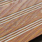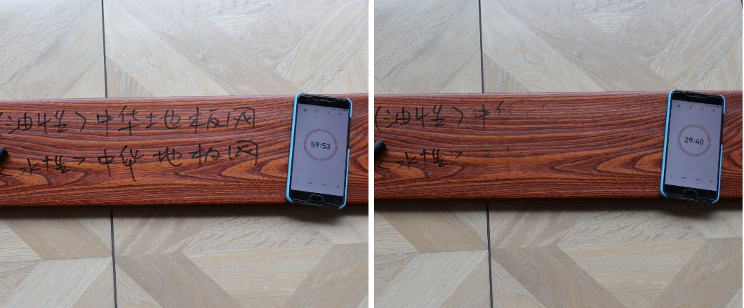 分別使用油性、水性筆在地板表面寫字,靜置三十分鐘,用濕抹布擦拭,耗時將近一分鐘,油性筆字跡有輕微殘留,水性筆字跡幾乎無殘留。受純實木地板的材質及榆木紋理特點影響,紋理凹槽有輕微污漬殘留,但不影響正常使用。