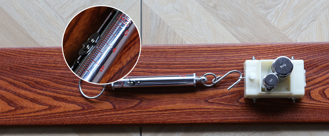 用彈簧拉力棒拉載重750g的小車,從垂直紋理方向拉動,讀數為5.2N,防滑性能優異。實木地板一般都是天然的紋理,沒有規律性的伸展,阻力較大,因而防滑性能優異。