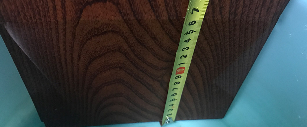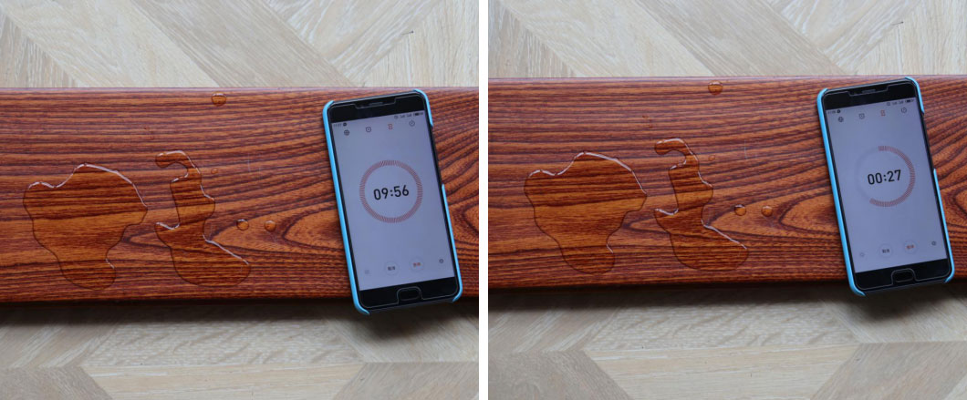 單塊地板表層倒水靜置十分鐘后,無水漬滲透現象,表層漆膜的防水性能優異。