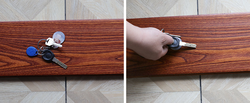 用鑰匙對地板表面進行刮擦,地板表面無明顯刮擦痕跡,耐磨指數表現優異。