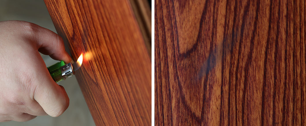 在地板表面用打火機直接灼燒,測試地板的耐高溫性能以及對頑固污漬的抵抗能力。實驗結果,該款地板在高溫灼燒下有輕微印跡殘留,且不易擦拭,純實木地板在耐高溫和耐火燒方面的性能相對弱一些。