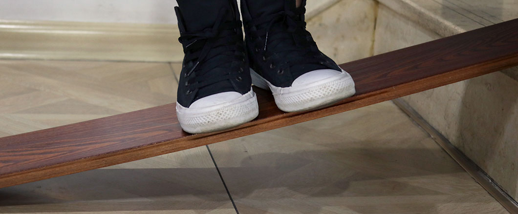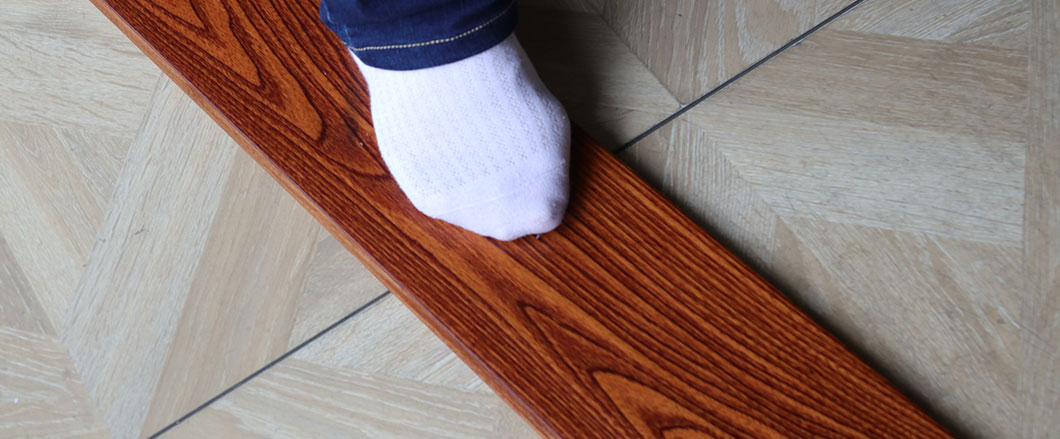 板材斜置,普通成人站立地板,板材厚實無明顯變形。
