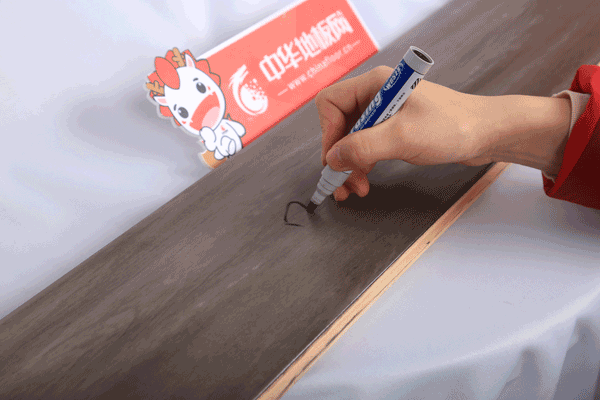 用黑色馬克筆在此地板表面寫上“中華地板網”,等30分鐘晾干,隨后用毛巾擦拭,只見大部分污漬都可被擦拭干凈,只留下一絲印記。因為純實木地板紋理豐富而細膩,因此在紋理縫隙處留下一點小印記擦不掉也正常,此印記也間接證明了梵·戴克地板——庭藝墨派為貨真價實的純實木地板,可以放心選購了。