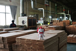 通過蒸煮、切片、干燥等工序,原料形成地板的最初雛形裸板。大友坯料存放區儲存量達到30萬方,坯料執行嚴格的片檢制度,專門的工作人員,對每一塊坯料進行外觀、長度、寬度、含水量等方面的檢查。保證無蟲眼、開裂等外觀上的瑕疵;長度、寬度在成品尺寸基礎上預留出10mm,用作開榫槽。