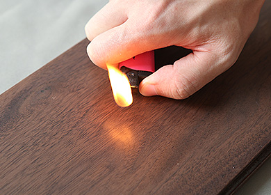 用打火機灼燒地板表面30秒,表面有輕微鼓包,無黑色煙熏痕跡,強力的漆膜附著處理提升了地板產品的耐高溫性能。