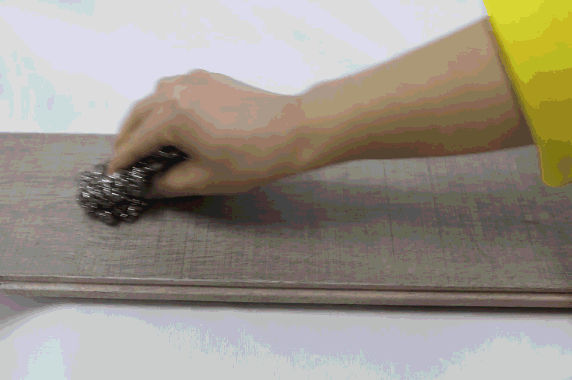 采用SPT微溶性強滲透耐磨技術,為檢測它到底有多硬,我們用鋼絲球在地板上反復摩擦,結果是表面看起來沒有明顯刮痕和破損,所以家里鋪裝此款地板,日常生活中的小刮小蹭就不用擔心了。