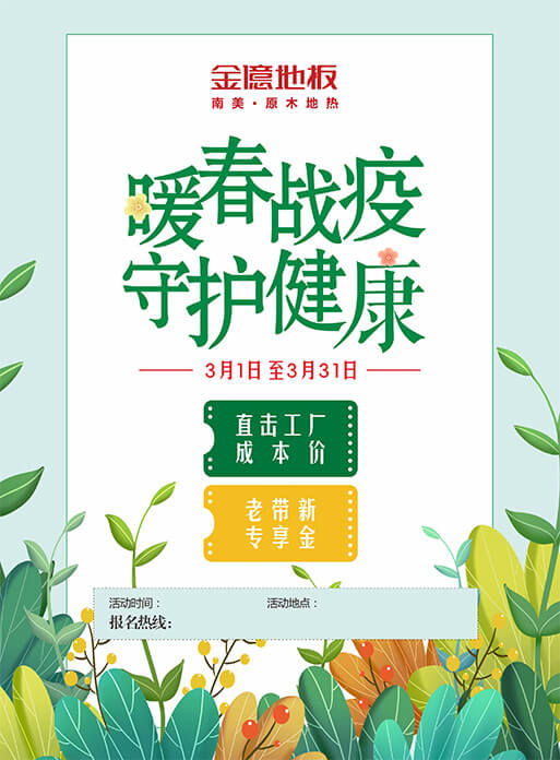 手機瀏覽中華地板網新冠肺炎疫情發生以來,我國舉國上下全力抗擊疫情,呈現出中華民族特有的韌性與團結,如今疫情已經成為全世界亟需面對的問題。但我們相信,沒有一個冬天不可逾越,沒有一個春天不會來臨。面對新冠肺炎疫情的嚴峻挑戰,只要各國人民齊心協力,團結如一,必能攜手迎來勝利時刻。時值當下,也正是考驗企業社會責任感與價值觀的關鍵時刻。中國地板行業頭部品牌金億地板,推出“暖春戰疫·守護健康”大型活動,助力消費者美好生活,誠意滿滿,不容錯過。